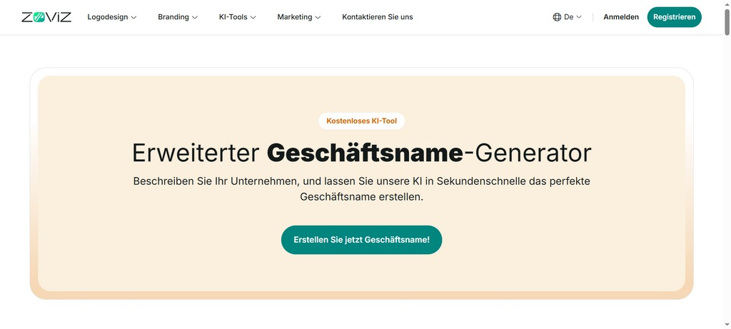 - Zoviz ist eine Top-Lösung für die ganze Business-Namensfindung. Es unterstützt Deutsch, hat KI-gesteuerte Analysen, prüft Domains und Social-Media-Profile und bietet Möglichkeiten zur Zusammenarbeit. Zoviz deckt alles ab, von der ersten Idee bis zur fertigen Marke. Es ist perfekt für Start-ups und Firmen, die eine starke und einheitliche Marke aufbauen woollen.